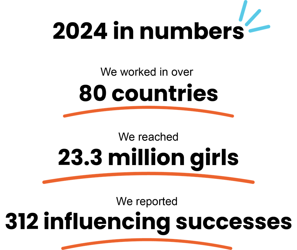 A graphic displaying highlights of Plan International's work through numbers in 2024, we worked in over 80 countries, reached 23.3 million girls and had 312 influencing success.