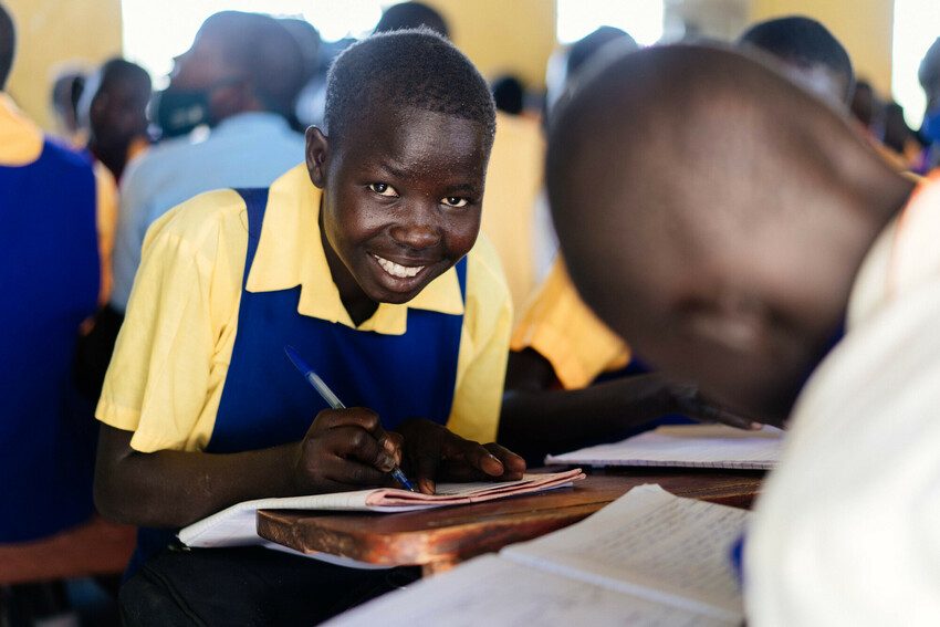 A boy smiling in a classroom.