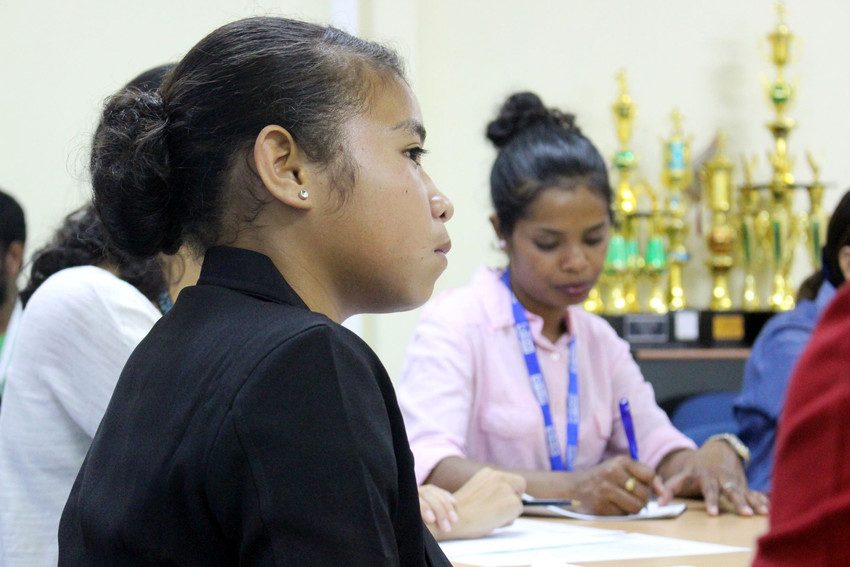 Girl raises her hand to ask a question in a classroom in Kon Tum Province, Vietnam.